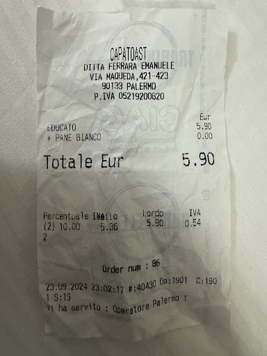 Read moreOur visit to CAPATOAST was a wonderful one during our stay in Hotel Verdi next door in Palermo! Greeted & welcomed by the friendly owner left us a great impression. Not to mention a HUGE sign outside the door that was appealing! The sandwich was HUGE & SUPERBLY DEE-LISH! Definitely will be back next time we are in PALERMO. - Ciao from Luci & Ron...
