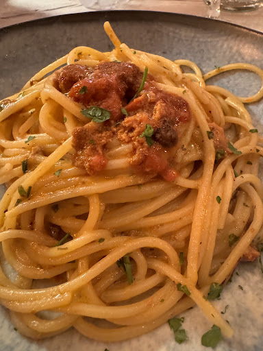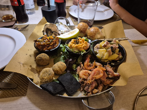 Read moreEsperienza deludente, a tratti sfiancante. Il locale è in centro, facilmente raggiungibile a piedi e con degli interni carini. Le note positive si concludono qui essenzialmente... Abbiamo ordinato un fritto come antipasto, ci hanno servito delle frittelle di zucchine crude all'interno - impasto crudo dal forte sapore di lievito e zucchina cruda e insapore - anelli di calamari di gomma e gamberi insapore... abbiamo lasciato quasi tutto e riportato la cosa alla cameriera (comunque è stato inserito nel conto), porzione anche scarsa per il prezzo. Come primi uno spaghetto ai ricci, unica cosa decente della serata, e un tonnarello fresco buonino, peccato che la pasta fosse di gomma e navigasse in chili di condimento grasso, dove il pesce si perdeva e per cui sarebbero serviti 4 digestivi dopo. Come secondi un filetto di cernia, arrivato freddo, condito anche qui eccessivamente fino a sparire sotto uno strato di pomodoro e rosmarino bruciato; altro secondo uno "scrigno" di pesce spada che era essenzialmente una mega polpetta di pesce, buona di sapore ma troppo grande, quindi troppo pastosa e fredda all'interno, con una panatura arrivata molle e fredda... Anche dei secondi abbiamo lasciato gran parte, dopo averli aspettati oltre 30 minuti. Vino che non ci è piaciuto, 2 calici lasciati quasi interi. Arriviamo alla cassa e aspettiamo altri 10 min, assistendo a una discussione riguardante lo sconto The Fork per un altro cliente... a noi è stato applicato senza problemi, ma abbiamo comunque speso una cifra esagerata per il cibo pessimo, il servizio caotico e gli standard della città. Sconsigliato categoricamente su...