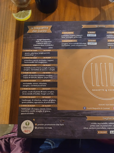 Read moreLa mia esperienza in questo luogo è stato positiva, tutto buonissimo, servizio ottimo, l'unica nota stonata sono i prezzi, ho trovato una tovaglietta di carta con due tipi di prezzo, uno già tagliato (che era il prezzo intero) e l'altro quello scontato, peccato che lo sconto del 50% dei piatti partiva da 40 € per un tagliere,e da 28€ per una baguette! Avevamo prenotato con "the fork", su cui vi era segnalato uno sconto del 50%, da una media di prezzo di €15 a persona, cosa praticamente impossibile! Abbiamo ordinato 2 baguette grandi e 2 baguette piccole,un acqua,2birre da 40, 1 da 20, e una bottiglietta di coca cola! Abbiamo pagato 65 € ovviamente lo sconto era già calcolato nella tovaglietta,quindi se fossi andata senza la prenotazione di The fork? Avrei pagato lo stesso prezzo? O...