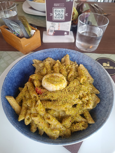 The food was just okay. The carbonara was extremely salty, and the pistachio pasta with burrata came with a tiny burrata – not what you'd expect for the price. Also worth noting: there’s an extra €2 charge per dish for gluten-free options, and they don’t serve café americanos.