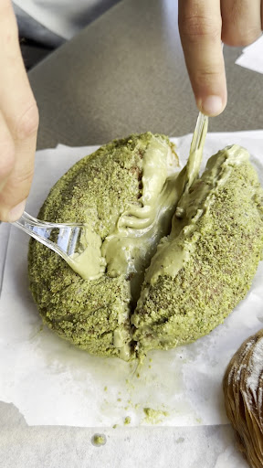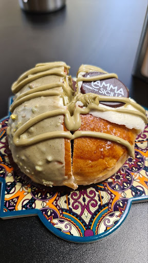 Tornando alla recensione, decido di prendere un maritozzo con crema al pistacchio da mangiare subito, e poi faccio incartare due cannoli al pistacchio ricoperti di granella di pistacchio e una mini mini cassatina mignon al forno però al pistacchio. Dopo aver ordinato, la gentile signora mi dice di sedermi che mi avrebbe portato il maritozzo al tavolo. Esteticamente ineccepibile, il maritozzo mi viene servito su una specie di poggia pentola tipo maiolica molto carino. Dopo il primo morso però la delusione ha il sopravvento. Brioscina pastosa (ma vabbè ci può stare dato che era quasi ora di pranzo e magari era stata preparata la mattina), ma soprattutto crema al sapore di cioccolata bianca con un retrogusto assolutamente non persistente al pistacchio. Do un secondo morso facendo attenzione a non sporcarmi e la sensazione viene confermata ulteriormente. Questa è tutto fuorché crema al pistacchio per come la intendo io. Questa avrà non più del 7-8% di pistacchio, quando una mediocre crema al pistacchio ha almeno il 20% di pistacchio (Alta Crema Pistacchio Mio, quella che usano la maggior parte dei panifici per intenderci) e una buona ne ha il 45% (come quella Deluxe in vendita al Lidl o altre artigianali). Per carità, non chiedevo una crema al 70% di pistacchio, anche se visti i costi sarebbe stato più giusto, ma quanto meno a quel prezzo mi aspettavo di sentire il sapore di pistacchio. Mi fermo al secondo morso. Non ne vale la pena rovinarmi il pranzo per una brioche alla cioccolata bianca ma verde. Passo in cassa con le mani sporche e la signora mi dice che posso usare il bagnetto. Ringrazio e torno in cassa per pagare col pos e prendere i due cannoli al pistacchio e la cassatina mignon al forno al pistacchio. Quindi 3 pezzi grandi e uno piccolo. Totale 17,50 ricapitolando per 2 cannoli al pistacchio, un maritozzo e un pezzo mignon, ho pagato 17,50. Cifra che avrei pagato più che volentieri se il prodotto avesse avuto un valore corrispondente o giù di lì, ma che è assolutamente fuori dalla grazia di Dio per la qualità del prodotto offerto. Torno a casa con la sorpresa, ma oltre al ringraziamento, l'espressione della mia compagna è esattamente la mia quando ho dato il primo morso al maritozzo: delusione.