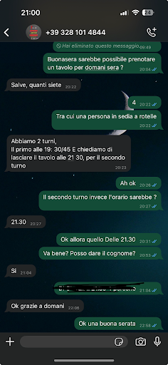 In data 29Novembre ho contattato il locale tramite WhatsApp per prenotare un tavolo per il giorno successivo ho specificato che c'era una persona in carazzina ma anche vedendo su Google e specificato che l'accesso è anche per i disabili comunque mi chiedono in quale turno ci volevamo mettere se quello Delle 19:30 o 21:30 così optiamo per le 21:30... Una volta recatomi sul posto intorno le 21.00 ho già notato da fuori la confusione che c'era all'ingresso così prima di fare scendere la persona disabile vado a dare una controllata all'interno praticamente si dovevana volare per arrivare alla "cassa" comunque non mi demoralizzo aspetto le 21.15 così faccio uscire il restante della famiglia dall'auto visto comunque il freddo ..arrivati davanti l'ingresso aspettiamo 5minuti ma c'era troppo freddo per rimanere fuori così decidiamo di provare ad entrare con fatica riusciamo ad entrare e mettere la carrozzina davanti la porta e noi di lato tutti ammassati e schiacciati visto che le persone avevano difficoltà ad uscire ed entrare ci spostiamo leggermente in un angololino sempre all'entrata facciamo presente che siamo all'interno e ci viene detto anche che non gli era stato detto che c'era la carrozzina ( se possibile metto la foto aggiungo lo screen della convenzione) e ci dicono di attendere che saremo chiamati passano 20 minuti li dentro era veramente vergogno gente ammassata che spingeva e per di più butatta sopra a mia madre che era in carrozzina dopo un po' passa la proprietaria ( o chi esso sia) e ci fa sapere che ci avrebbe chiamato... Nel frattempo gente che spinge perché vuole entrare gente neanche in lista che aspetta un tavolo noi nel frattempo decidiamo se andare o rimanere visto che comunque la gente pestava i piedi a mia madre o si buttava vicino alle sue gambe ( persona in carrozzina) comunque visto che il locale non ha dato "priorità" a persone disabili decidiamo di andare via quindi questa è stata la nostra esperienza negativa, un consiglio che posso dare a locale è di o non mettere che l'accesso è anche a persona in carrozzina o semplicemente gestire meglio il locale...