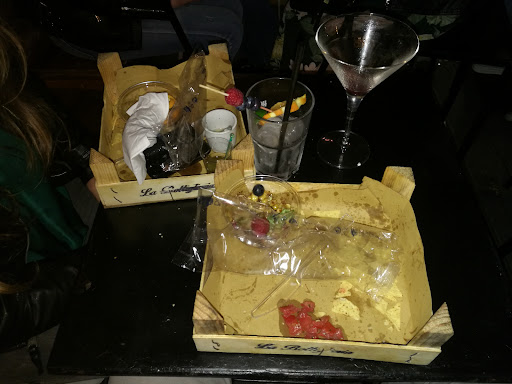 Allora, avrò mangiato un 3 o 4 volte,dalla prima alla quarta volta la qualità delle cassette con cui è servito l'apericena è andato degradando in una maniera assurda,patatine secche,insalatine di riso condite coi i rimasugli di pollo,olive e altre cose,una specie di fettina di frittata con gli spinaci che sa solo di uovo,patatine in busta servite per spizzicare,sembrano esser lasciate all'aperto e prese d'aria,patatine fritte orrende,secche e gommose, insomma un bel blocchetto intestinale,un po'di caponata decente,e mezza piadina"prosciutto e mozzarella"che non sa di nulla...parliamo del locale,banco dove viene servito il bere è molto carino,locale piccolo,stretto al massimo 4 tavolini,si estende fuori con altri tavolini sulla strada a dislivello,mancano le sedie,alcuni siedono su alcuni sgabelli,molto scomodi sia questi che la posizione dei tavoli...insomma prima era meglio adesso è completamente un no,seppur con meno di 10 euro riesci a farci una cena con...