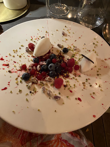 *8 : Dessert : deux petites boules de glaces sur un colis de fruits rouges, des fruits rouges et des fruits secs.