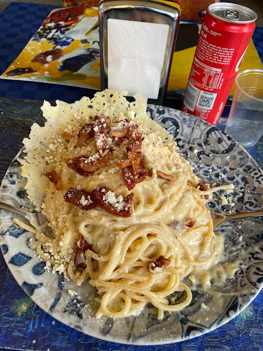 What a journey through the wonders of a Sicilian carbonara at a Ballarò market. Picture this: I felt like sitting down, hungry as a bear with a PhD in pasta appreciation. Suddenly, it arrives – a plate of creamy, dreamy spaghetti alla carbonara that could make even the coldest heart melt. The eggs were so fresh, they were practically clucking at me, and the pancetta was crispier than a potato chip. I didn't forget the pièce de résistance: "il signor pecorino", sprinkled cheese on top like edible fairy dust, and that crunchy crust, mamma mia! It was like a symphony in my mouth. So, if you're ever in Ballarò and craving a taste of heaven (in pasta form), this carbonara is your golden ticket. It's not in the menu but ask it anyway. Just remember to bring your stretchy pants – you're gonna...