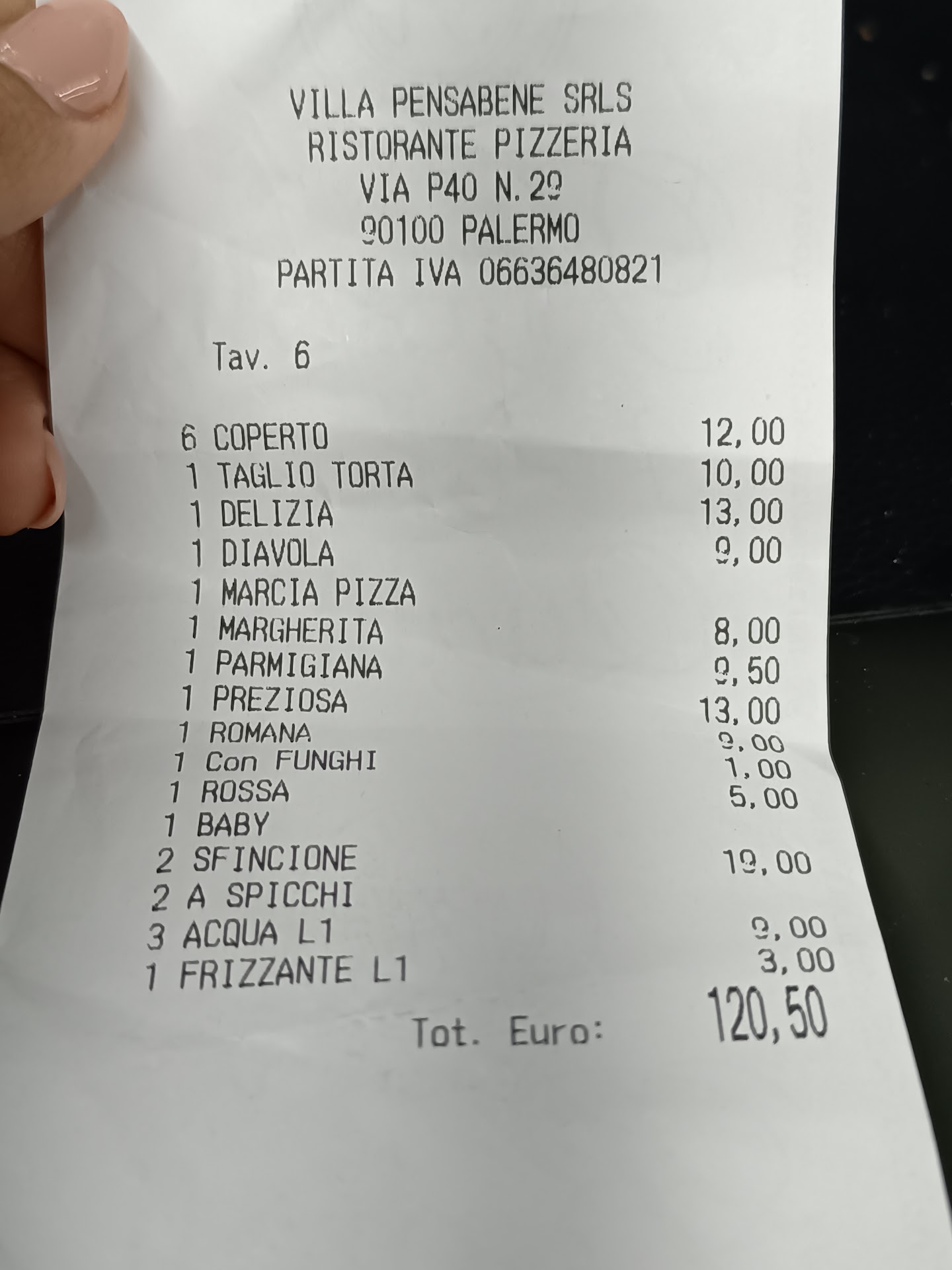 Read moreIn occasione del compleanno di mio marito, ci rechiamo in questa pizzeria dove più volte abbiamo mangiato la pizza di cui non ho nulla da dire sul fatto che sia molto buona. Ma ieri ho assistito e a sua volta fatto brutta figura con genitori e cognati a dei comportamenti ingiusti. Il primo è che eravamo in 6 e ci hanno proposto la coca-cola in lattina quando noi volevamo una sola bottiglia dato che eravamo in 6, ma che non ne avevano e che il giropizza parte da 8 persone. Ok. Fino a quando non vediamo il tavolo accanto con 7 persone (noi eravamo in 6) non solo usufruire del giro pizza ma non solo, x loro ma x tutti coloro che avevano la formula giro pizza, arrivare bottiglie di coca cola in bottiglia da un litro. Ci viene detto che non possono darcela perché non abbiamo il giro pizza. Ma in che senso? Dopo di ciò al momento torta diciamo espressamente di volere soltanto i piattini che al taglio e tutto ciò pensiamo noi. Troviamo sullo scontrino +10€ per il servizio taglio torta quando per scelta abbiamo fatto tutto noi senza che loro proponessero nulla comunque. Ci viene detto che loro lo avrebbero potuto fare comunque ma che ciò che paghiamo è il fatto di tenere occupato il frigorifero. Assurdo totalmente ridicolo. Ciliegina sulla torta sullo scontrino non fiscale viene allegata l'acqua che sempre a noi veniva data in bottiglia di vetro chiaramente più cara, ai giro pizza in bottiglia di plastica. Una bottiglia da 1 litro come segna lo scontrino 3€, peccato che le bottiglie come si vede in foto erano da 75 ml ahahah quindii spettava un altra bottiglia gratis dato che non erano da 1 litro. Comunque siete stati totalmente ridicoli soprattutto x esservi pagati un servizio non fatto tra l'altro ma solo per aver occupato il frigorifero con una torta da nemmeno un chilo. 10€ e quasi costato più lo spazio in frigo che la torta. Ridicoli. Non ci vedrete mai più s con ciò faremo cattiva...