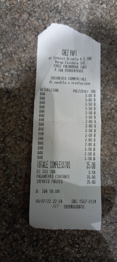 Read moreCi siamo stati a stasera per ritrovare la città di Palmanova e all'oscuro di un concerto oggi 09 Luglio 2022,con una musica "balcanica",specificatomi dalla mia compagna e mamma delle nostre 3 Bellissime bambine,per cena ci siamo fermati qui. 2 bruschette semplici,premetto che la mia compagna ha specificato le sue allergie, più 1/2 bruschetta per le bambine,2 succhetti,2 spritz aperol richiesti leggeri per via dell'allattamento,tutto okay ,ottimo il trattamento,prezzi un pochino alti ma,è sempre Palmanova,una città storica,Unica Città Stellata al Mondo e c'è l'abbiamo Solo Noi. In Fede...
