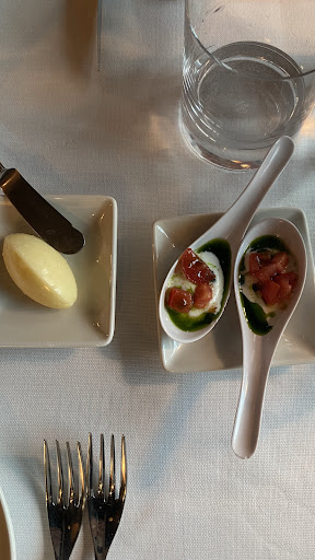 Read moreSono andata in questo locale in compagnia di un amico, a pranzo, e abbiamo deciso di dividere un antipasto e poi prendere due primi, in seguito avremmo deciso se provare anche qualche secondo. Il locale è un po'scomodo e invisibile da fuori, a causa della struttura del teatro due, ma dentro è ben arredato e curato. Stile moderno. Il servizio è stato eccelso, nessuna sbavatura da parte dei camerieri, nonostante fossero davvero piccoli. Anche i direttori di sala erano sempre presenti nel caso in cui ci possano essere problemi. Il prezzo non posso valutarlo perché il pranzo mi è stato offerto Il cibo: appena accomodati ci hanno portato pane e focaccia fatti in casa e burro salato. Il pane era squisito e in più ogni volta che lo terminavi te ne veniva portato un altro pezzo. La focaccia l'ho trovata un po' duretta, troppo croccante, quasi a graffiare il palato. Nulla da dire sul burro salato. In seguito ci hanno accolto con un entree di benvenuto dello chef, un simil ghiacciolo di salmone panato e fritto con crema di parmigiano e salsa al ribes rosso. La panatura era croccante, ma unta, cosa che si è trasmessa al salmone sottostante, che nel mio personalissimo caso era troppo cotto e unto. A causa della presenza dell'olio le salse non si percepivano per niente Abbiamo poi ordinato un antipasto a base di gamberi crudi con crema di peperoni gialli, paprika e alga nori. Forse il piatto che più mi ha convinto. Il gambero era perfetto, dolce e ben condito. La salsa talmente buona da essere stata "scarpettata". Dopo questa prima portata viene offerto un cucchiaino di succo di ananas e lime per sciacquare la bocca e prepararla per la seconda portata, per noi composta da gnocchetti all'astice e pere per il mio amico e risotto allo zafferano e liquirizia per me. Qui c'è la nota dolente. Mentre gli gnocchetti all'astice erano più che perfetti, il risotto l'ho dovuto rimandare indietro. Non so se è stata una mia disattenzione, ma non era stato specificato nel menù che il risotto era alla parmigiana e solo sopra era posta una crema allo zafferano (nemmeno troppo saporita) e una polvere di liquirizia. Non amando il parmigiano ho richiesto di farmi portare un altro piatto, che è stato un secondo, piovra con cipollotto ed edamame. La piovra era arrostita perfettamente, tenerissima e morbida. Si masticava tranquillamente. Il cipollotto adagiato sopra si sposava perfettamente con il pesce, accompagnato anche da una crema di zucca per legare tutti gli ingredienti. Gli edamame davano la parte croccante al piatto. Avrei preferito del limone sulla piovra, ma solo per un gusto personale. Non abbiamo preso dolci. Esperienza un po' mediocre che mi ha lasciato l'amaro in,bocca per via di quel risotto. C'è ancora del lavoro da fare per arrivare a prendere una stella, ma lo chef è sulla...
