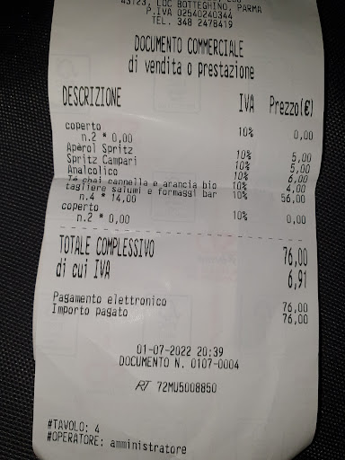 Read morePessima esperienza, non ci tornerò mai più. Tortelli di erbetta e di zucca immangiabili e senza sapore. Impasto senza sale ed il ripieno insapore. Unica nota positiva e stato l'antipasto di salumi che ovviamente non hanno cucinato loro. Servizio e personale anonimo contando che stavamo mangiando su delle tovagliette di gomma. Menu da 33 euro con antipasto, bis di tortelli e una bottiglia di vino in 4 con conto totale a 35 euro a testa. Considerando tutto ciò è stato un vero e proprio furto. A Parma ci sono almeno 6 o 7 posti migliori.