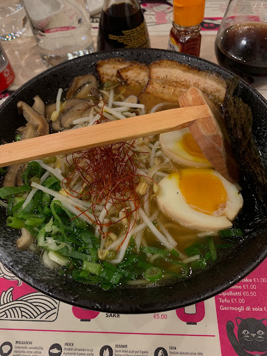 Read moreCome valuto i locali: una stella per il cibo, una per il servizio, una per l'atmosfera e una per la tipicità. Normalmente non sono così netto nel valutare un locale, trovo spesso qualcosa di valido in un ristorante per non dover dare un giudizio negativo. Questa volta non salvo niente. Il servizio: un ora e quindici minuti per un piatto di ramen? Veramente? Un menù che contiene refusi sui nomi dei piatti? Per carità... L'atmosfera: troppo rumore, troppi stereotipi, troppo artificiale. Il cibo e la tipicità: nulla che non si trovi in un qualsiasi all you can eat finto-giapponese, ma in uno di quei locali per lo meno ti viene servito caldo. In più, e lo dico da cuoco che per anni ha viaggiato in Giappone, quello che servono non è ramen giapponese. Il ramen giapponese è una cosa ben precisa, costruito con un ben preciso criterio. Può piacere? Forse a chi non ha mai mangiato vero ramen giapponese, a me ha lasciato un profondo senso di delusione. Non c'era una parte giusta, non i men, non il dashi, non c'era salsa tare, non c'era olio, il tonkotsu (non tonkatsu, il tonkatsu è la cotoletta di maiale) non era tonkotsu ma semplice brodo. Cercate originalità e un buon prodotto? Qua non troverete...