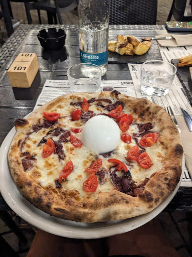 Read moreArrived at 22.00, the Bella e Buona di Troppea pizza was slightly overcooked but still good and they had run out of the confettura di fichi e miele without telling us before ordering. The croste di parmigiano reggiano Bertinelli was the worst thing I have tried in over two months of travel in Italy, I was amazed I didn't break a tooth. Most of the wait staff speaks English, which was nice when needed. The bathroom was filthy, the toilet wouldn't flush so there was a mountain of toilet paper in the bowl. I got locked in the bathroom after turning the key twice and had to cry for help, a waiter came to my rescue and told me to take the key out and then put it in again to unlock the door. A star for him alone. One waiter asked us to leave a five star rating and we could earn points to earn a coffee or dessert but that same waiter who helped swooped in and said we could have one for free because I asked where the figs were. They seemed a little conflicted. We didn't want coffee or dessert, so we left. Lots of people in their 30s-50s on a Friday night. Le patate al forno were nothing spectacular. Overall, a bit overpriced for the experience. The outer courtyard with banana trees had tables spaced nicely for private...