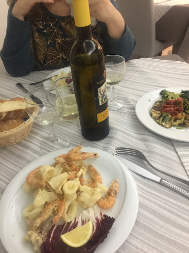 abbiamo preso due fritture di mare o meglio erano gamberi e totani ( molto secchi dubito fortemente fossero freschi e comunque freschi o surgelati molto secchi sia i totani che i gamberi ) un contorno di verdure bollite ( buono ) una bottiglia di vino bianco falanghina ( pessimo !!! ) è un quartino del loro vino bianco sfuso della casa ( pessimo anche questo ) una bottiglia di acqua e due dolci della casa ( non ci sono piaciuti in quanto la crema di mascarpone aveva già qualche giorno e al palato risultava acida ) il servizio .... lasciamo perdere ......