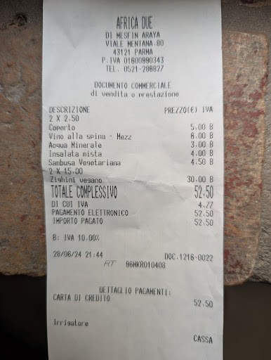Read moreDalle recensioni credevo fosse un ristorante etnico, ma non lo è. Si tratta di una pizzeria, che fa anche piatti di pesce, e a menù sono presenti 2 piatti africani, lo zighinì e il cous cous. Stop. Io e la mia morosa abbiamo provato entrambe lo zighinì, uno vegetariano e uno completo: sinceramente, al di là del gusto personale, si trattava di un piatto preparato senza particolare abilità, come potrei prepararlo io leggendo la ricetta su internet; sapore poco interessante, olio di bassa qualità. Spesa abbastanza ordinaria, 26 euro in 2, ma senza prendere nemmeno un extra. Solo acqua e i due piatti unici. Quindi potevamo spendere, senza nuocere alla loro economia, 18-20 euro. Non ci tornerei in quanto è fondamentalmente una pizzeria con forno elettrico. E di pizzerie ne conosco decisamente di...