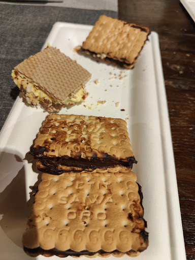 Ma il vero piatto forte che hanno avuto anche il coraggio di definire "dolce" nel menú fisso sono stati GLI ORO SAIWA UNITI CON LA CIOCCOLATA. Era questo il "dolce" di questo ristorante, oltre che 2 wafer uniti con una crema che sapeva sgradevolmente solo di burro. Allego foto perchè sembra quasi incredibile ma è vero, sembrava un dolce fatto da un bimbo di 8 anni.