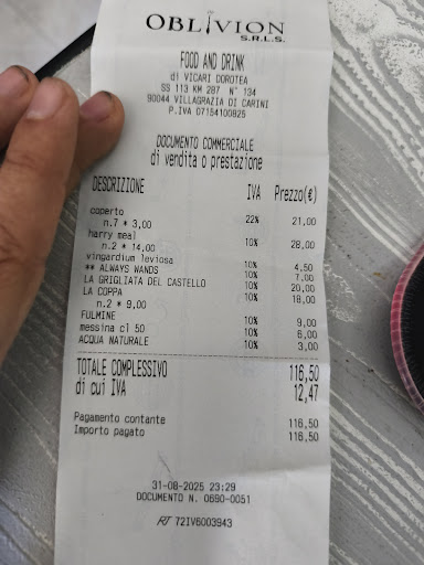 Oblivion, forse più che il nome del locale è un suggerimento a dimenticare questa esperienza il prima possibile... Anticipo che è stato un disastro in cucina ineguagliabile, ma andiamo per ordine... Abbiamo partecipato alla serata-evento "Back to Hogwards" pubblicizzata sui loro canali social in cui ci si prospettava una serata di "gare, sorprese e incantesimi". Abbiamo prenotato come tanti altri il nostro tavolo per le 21.30 e puntuali ci siamo presentati. All'ingresso non c'è stato nessuno "smistamento nella tua Casa dal Cappello Parlante" come avevano promesso. Ci accomodiamo e scegliamo le nostre portate dal menù. Dopo mezzora viene il cameriere per raccogliere le ordinazioni: Una Bistecca alla Fiorentina---NON C'E' Antipasto "Foresta Incantata"---NON C'E' Allora decidiamo di cambiare la bistecca con una pizza ma con impasto "Pinsa Romana" come da loro proposto sul Menù---NON C'E' NEPPURE QUESTO. Ci viene anche detto "ma vi hanno mandato a controllare? Comunque ci dispiace ma stasera abbiamo avuto tanta gente e prossimamente chiudiamo per qualche giorno". Quindi praticamente stavano svuotando le scorte... Faccio presente che tutte queste mancanze in menù in una serata tanto reclamizzata erano inaccettabili non essendo nemmeno un locale a buon mercato e con praticamente tutti prenotati. Comunque ordiniamo e andiamo avanti anche per i bambini. Portano le bibite e ci portano lattine di Coca Zero a fronte di una richiesta di Coca cola normale. Si saranno sbagliati? Chiediamo di cambiarle ma il cameriere costernato ci dice che NON CI SONO NEPPURE QUELLE, FINITE! Senza neppure dircelo ci avevano portato quelle zero. Il cameriere si scusa sentitamente ma ci dice che lui ovviamente non è responsabile, si rende conto delle ripetute mancanze e che riferirà a chi di dovere le nostre lamentele. Arrivano le patatine. Completamente senza sale. Poi arrivano per due volte tre piatti che già avevamo al nostro tavolo ed una quarta portata non presente nel nostro ordine che facciamo ovviamente riportare indietro. Delirio nelle comande e camerieri che vanno in giro con piatti che non sanno di chi sono. Arriva poi la Grigliata mista di carne (senza sale anche questa) con tris di patate che presenta in realtà solo un tipo di patate. Facciamo presente anche questo ed il cameriere ci dice "lo immaginavo che mancavano, le faccio fare". Le abbiamo rifiutate ma le hanno portato lo stesso. Lasciate sul tavolo così come gran parte della grigliata. Incommentabili. Nel frattempo ci doveva essere anche l'intrattenimento che si è limitato fino a quel momento al passaggio di Piton. Poi dopo aver raccontato al Maestro responsabile dell'intrattenimento con la cucina ci ha fatto venire al tavolo tutti i personaggi per rimediare. Devo dire che è stato davvero gentile e sinceramente dispiaciuto per quanto di sua competenza. Attori veramente bravi devo dire e apprezzatissimi dai bambini anche se di pozioni, gare, sorprese e magie nemmeno l'ombra. Alla fine il conto senza nessuno sconto viste le loro mancanze e gli errori in preparazione. Usciti fuori 60 secondi di fuochi d'artificio sparati sulle nostre teste, tutti sporchi di cenere, noi i bambini e le macchine. Consiglio, aprite un teatro, chiudete la cucina. La ristorazione è un'altra cosa.