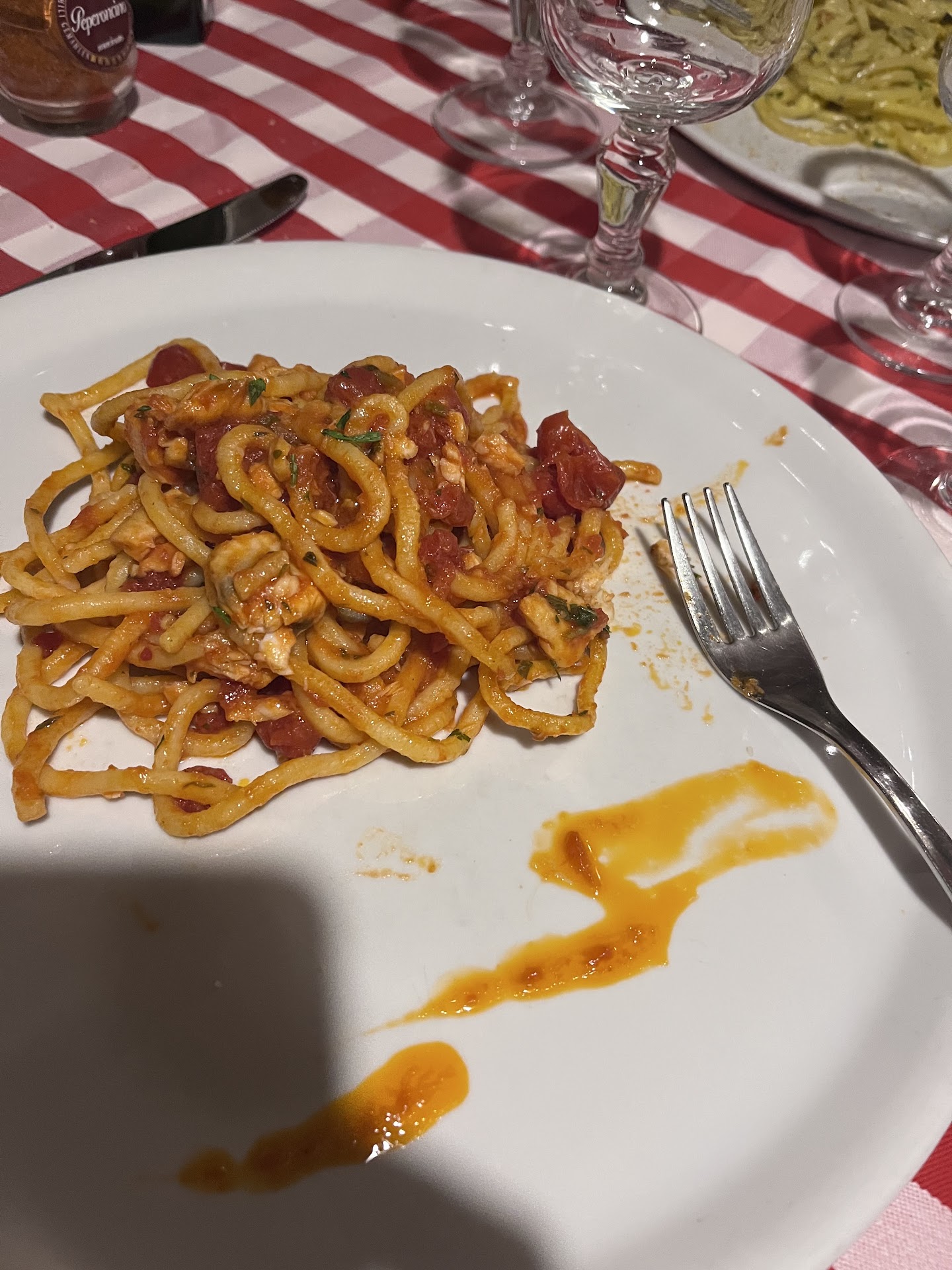 Read moreStorica trattoria di Passignano, portata avanti da decenni dalla stessa volenterosa famiglia; le sale interne sono accoglienti e dall'atmosfera tradizionale, come una trattoria dovrebbe essere, ma l'esperienza più bella è mangiare nella piazzetta o nel vicoletto all'esterno, sotto un bellissimo pergolato, in particolare nelle serate estive: allora si crea quella magia che solo pochi ristoranti sprigionano e che insieme alla bontà del cibo ti può rendere, per il tempo della cena, felice. Il menù è sia di terra che di lago, ma devo ammettere che, amandoli particolarmente, ho sempre e solo provato piatti di lago. L' antipastissimo è irrinunciabile, con diversi golosi assaggi a base di pesci di lago quali ad esempio il persico, il boccalone, la carpa, la tinca, insomma un piatto tutto da scoprire e da godersi! Ottimi anche i primi, con la pasta artigianale che si lega benissimo ai sapori lacustri, anche se i secondi sono quelli che preferisco, soprattutto la stupenda anguilla al coccio con fagiolina del Trasimeno, opulenta, gustosa, da mangiare obbligatoriamente (o inevitabilmente) sbrodolandosi... Buonissimi i vini in carta assaggiati, bianchi e rosati della zona del Trasimeno in particolare; conto onestissimo, prezzi assolutamente giusti per la qualità e la quantità. Il Pescatore ha anche una casa vacanze, con spaziosi e comodi appartamenti attigui alla trattoria, che vorrei consigliare per il pernottamento. Un abbraccio a tutto lo staff, in particolare a...