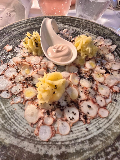 Come antipasti ho provato il polpo con lime, delicatissimo e fresco, ideale per la stagione, e un piatto con gamberi e seppie su fonduta di patate: dal sapore più deciso, forse l’avrei preferito leggermente più asciutto, ma comunque interessante.