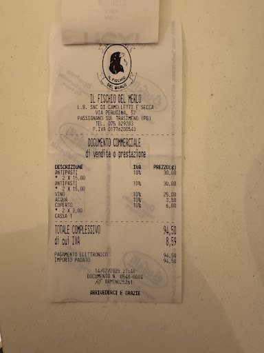 My husband and I were traveling from Assisi to San Casciano dei Bangni and because we had time, we chose a spot along Lake Trasimeno for lunch. We had the best meal since we have been in Italy! Our server Mauro, assisted us with understanding the menu and our choices were nothing but perfection! We were served complimentary champagne, a lovely croissant with a fish crème before our enteree. We typically don’t order the three courses and Mauro suggested the (in my English) the fish soup (many types of fish!!!) and I had the plate with shrimps on a towering skewer, prawn, a fish filet, octopus and crab. Amazing presentation! We also had a berry desert…..yum! We were given a tour of the lower level tasting room/dining room. What a treat to see all of the wines and liquors. The owner and my husband traded cigars and it was a lunch we will never forget. The establishment is a wealth of thought out design! Our accolades...