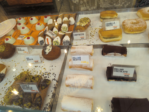 Locale tipico siciliano, forse con un po' troppi luoghi comuni. La musica siciliana in filodiffusione fa sembrare che, in Sicilia, si ascolti tutti i giorni questa musica tipo anni del dopo guerra. Ho mangiato il cannolo espresso ed era molto buono. Mio figlio un rolló con wurstel senza infamia e senza lode. La ciambella fritta che ha preso mia moglie, invece, ci voleva fantasia a definirla siciliana. Era praticamente la ciambella industriale con la consistenza di un donuts. Nulla a che vedere con le vere ciambelle palermitane. Inoltre, mettere al bancone una ragazza che non è mai stata a Palermo e non sa neanche cosa sia la vucciria e le cose che la circondano ha poco senso. Comunque, nel suo insieme non è male come locale. Un pezzo di Palermo al nord che fa...