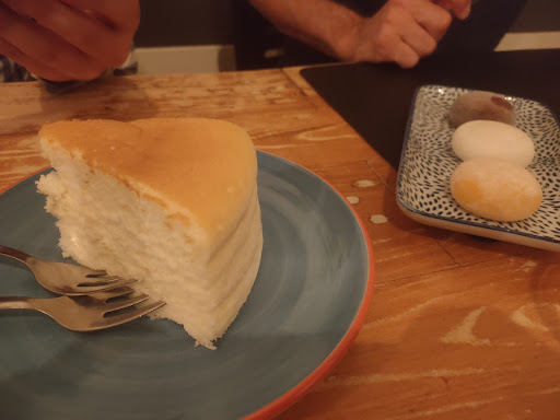 Mi stavo per dimenticare che hanno la cheesecake giapponese, servita con sembrava una confettura di fragole o sciroppo di fragole, era molto delicata