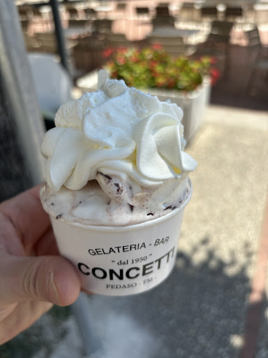 La piazzetta estiva, dall'altra parte della strada, propone tavoli comodi e freschi serali. Concetti, bar e gelateria classica, offre oltre alle coppe e ai gelati da passeggio, anche ottimi aperitivi ben accompagnati con stuzzichi vari e vini prettamente locali da gustare in tranquillità . Nel dopocena il locale si riempie di clienti, paesani e turisti s'incrociano tra coni e chiacchiere, i camerieri sfidano impavidi l'attraversamento stradale con ordinazioni e slalom tra le sedute. Sarebbe magari auspicabile una maggiore elasticità negli affollati momenti clou...vabbè prima lo scontrino della consumazione, ma se il sito è pieno un attimo di...