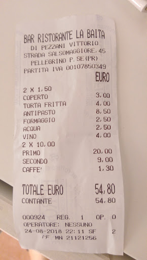 Posto caratteristico, particolare nel suo genere...uno di quei locali che ti piace o non ti piace. Adatto per cene e/o buvete in compagnia visto che è anche pub. Si trova sulla strada che da salsomaggiore porta a pellegrino quindi molto adatto x scappare dalle torride sere d'estate della pianura. Deve essere stato suggestivo, quando, nei tempi che furono, in inverno nevicava ancora ed in zona c'erano impianti di risalita passare qualche ora in questo locale😁 ! Noi siamo stati in settimana e non c'era praticamente nessuno, un po' triste😢...però siamo stati ugualmente bene. Menù tipico parmigiano...mi è piaciuta molto la torta fritta 10 pezzi in due, asciutta, bella gonfia e di una giusta pezzatura accompagnata con salumi misti e gorgonzola...la prossima volta voglio assaggiare i panzerotti!!! Abbiamo poi proseguito con abbondanti tagliatelle ai funghi. Io poi ho preso una punta di vitello al forno...mangiabile ma non degna di nota. Mezzo litro di vino bianco frizzante acqua e un caffè...54€. Una piacevole base musicale di sottofondo al giusto volume. Ho letto sul menù che c'è la grolla valdostana...da provare sicuramente...