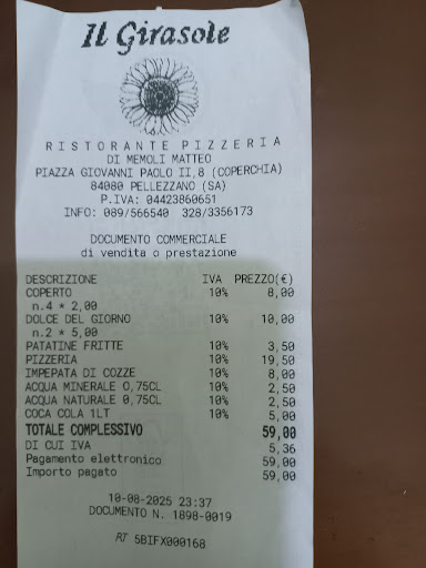 Read morePizzeria situata nel comune di Pellezzano (SA) e precisamente nella frazione di Coperchia. Pizzeria sì ma anche ristorante con specialità salernitane "condite" dalla fantasia del titolare. Si consiglia di provare le pizze davvero fantastiche, sia per la bontà nella cottura che per la genuinità dei prodotti utilizzati. Altro consiglio è provare assolutamente la frittura sia di pesce che di altro genere (frittelle iniziali di antipasto oppure patatine, ecc.) perché viene fatta in modo superlativo senza essere unta e croccante nella giusta misura. Prezzi buoni quindi ottimo rapporto qualità del cibo con il relativo costo. Anche i dolci sono ottimi, da provare come fine pasto. Il ristorante pizzeria il Girasole si trova in una zona tranquilla e non movimetata, ideale se si vuole evitare la confusione della...