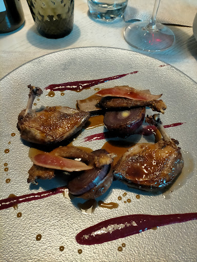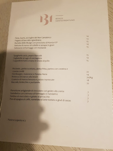 Bosco 131 si presenta bene ma senza eccellere nello stile, presentando alcuni elementi di arredo abbastanza comuni. Il tavolo che ci è stato riservato era dalle dimensioni abbondanti per due persone non risultata sgradevole, posizionato nel mezzo della sala centrale in una zona di passaggio del personale ma senza che se ne percepisca il disturbo, anzi con una bella vista in lontananza della griglia. Il menu era ben sintetizzato in una pagina sola, e incuriosisce i visitatori (mi sono scordato di chiedere ogni quanto viene variato). Decidiamo di condividere l’antipasto con fegato di baccalà e giardiniera chiedendo un abbinamento di vino. Il piatto nel complesso era ben concepito, con il gusto del baccalà definito e la giardiniera a bilanciare la grassezza del fegato, forse una nota acida eccessiva che emergeva dagli elementi delle verdure ma nel complesso gradevole. L’abbinamento del vino e’ andato su un gradevole rose. Entrambi scegliamo come portata principale il piccione con petto scottato, aletta fritta, panino con coratina e coscia confit. Le differenti parti della portata vengono presentate su diversi piatti in maniera elegante anche se alcune parti sono già viste (come la crocchetta fritta con l’osso a creare una sorta d'impugnatura e invitare il finger food). Le differenti parti era assolutamente gradevoli con il petto scottato dal gusto intenso e la cottura perfetta (la mia parte preferita), la crocchetta ottima ma leggerissimamente secca (aspetto che fa subito capire la necessita’ dell’abbinamento con la maionese), la coscia ottima ma appena indietro di cottura (quella della mia dinner partner era ideale invece). Il panino di coratina potrebbe fare storia a parte, piccolo nelle dimensioni ma intenso ed esplosivo nel gusto che mi ha fatto subito riportare i complimenti alla cucina anche prima di finire tutte le diverse componenti della portata. L’aletta, per sua intrinseca caratteristica, era molto magra e credevo fosse evitabile, ma poi capiremo dopo perché viene inclusa. I dolci che hanno completato la cena sono stati il tortino al cioccolato con il buonissimo gelato al pistacchio e il panettone artigianale (buonissimo) con il gelato alla crema, quest’ultimo leggermente più anonimo rispetto al precedente. Il servizio del ristoratore e di sua moglie e’ stato molto amichevole ma non invadente e la ragazza che li aiutava un po’ timida nell’approccio ma molto efficiente. Il saluto finale di Piergiorgio lo chef e’ stato molto gradito anche nella spiegazione generale nel concept del piccione in cui voleva dare importanza a tutte le parti (ecco spiegato infatti anche la presenza delle parti meno nobili) anticipandoci anche un piccolo assaggio-spoiler per la prossima versione del piccione che includerà anche la pelle croccante. Il conto risulta essere nella forbice delle aspettavi anche se nella fascia più alta, cosa che potrebbe schizzare più alto il totale qualora si opti per una bottiglia anziché per il calice singolo.