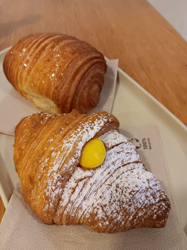 Read moreLale bakery x quel che mi riguarda e stata una bella scoperta. Mi ricordavo di questa bakery poiché qualche mese fa uscì un video ad opera di uno giovane you tuber gianluca bianchi il quale a mio modesto avviso affermava con molta superficialità di aver riscontrato una carenza di burro nei lievitati di questa bakery moderna. Che questa bakery sfornasse prodotti vegani con basso contenuto di grassi ci potevo credere ma x il resto ni. Sono stato molto contento di aver ricevuto la risposta della bakery successivamente al mio post non so chi mi ha risposto comunque ho avuto le risposte che attendevo vale a dire, la pasticcera usa un burro di qualità quello di Normandia, allo stesso tempo mi hanno spiegato il loro sforzo x dosare al meglio questo ingrediente sopratutto x la sfogliatura dei croissant, a mio modesto parere il risultato è pazzesco, ho trovato dei prodotti leggeri ma al tempo stesso eseguiti a regola d'arte se si parla di sfogliatura cottura e gusto. Nel croissant ho apprezzato la vera vaniglia nella crema, secondo me buona saporita, anche la consistenza mi è piaciuta alcuni hanno affermato che era budinosa, io personalmente lho trovata equilibrata. Pain au chocolat che per forma e x come era sfogliato assomigliava più al pain suisse, ottime le due barrette di fondente di qualità e x il resto stesso discorso del croissant. Prezzo 7€ per due sfogliati e un succo di pesca.bakery super consigliata e auguro buon...