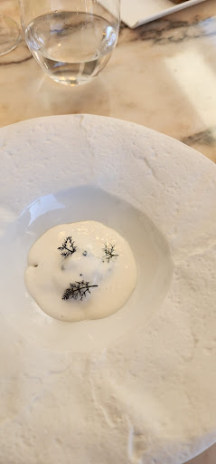 Il pre-dessert, un cubetto bianco di ricotta e finocchietto su ghiaccio, offre una sorpresa gustativa piacevole. Il dessert finale, una spuma di aglione con gelato al finocchietto, è un colpo di genio culinario, tanto insolito quanto efficace. Il conto finale di 279 euro e' una cifra impegnativa (anche dovuta al ricarico sulle bevande), ma in questo stadio culinario, la spettacolarità dell'esperienza quasi giustifica la somma.