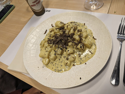Food was nice, really the pasta, I keep saying pasta but yeah it was good, the truffle made it rich but not too much, I could eat again. My friend kept saying the meat was soft soft, like cut easy with knife. Service, friendly but not pushy, he talked about local wine, I liked that. Place had this cozy style, a bit old walls, warm lights, some noise but not too loud, sometimes I didn’t even notice the people next to us. Prices maybe not cheap, I said this already, but we didn’t feel robbed. I would come back, maybe just for dessert because I regret not trying it, it passed near us and looked delicious, I swear I was almost standing to ask...