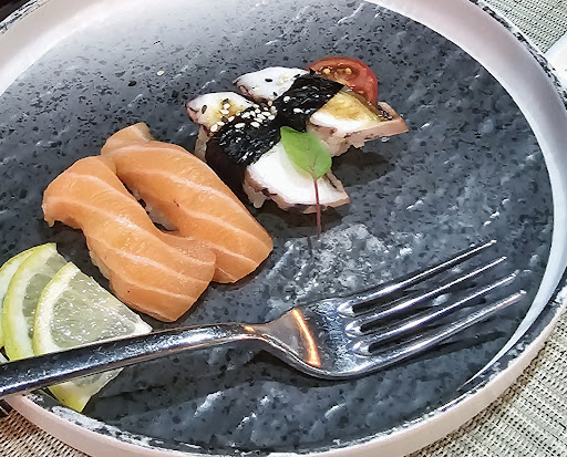 Le porzioni sono state la delusione maggiore: i nigiri erano ultra-minuscoli, mai visti così piccoli, al punto che due insieme non arrivavano a riempire un boccone. Due insieme erano uguali a metà nigiri di altri ristoranti e non sto esagerando! Quello al polpo aveva sopra una fettina sottilissima, praticamente inesistente. Una vera presa in giro, tanto che inizialmente pensavo fosse un assaggio gratuito. Anche un roll che ho ordinato era del tutto anonimo, con poca sostanza e privo di sapore. Ho ordinato alla carta, non in formula all you can eat, ma i prezzi erano identici a ristoranti che servono porzioni almeno quattro volte più abbondanti. Mi sono sentito preso in giro.