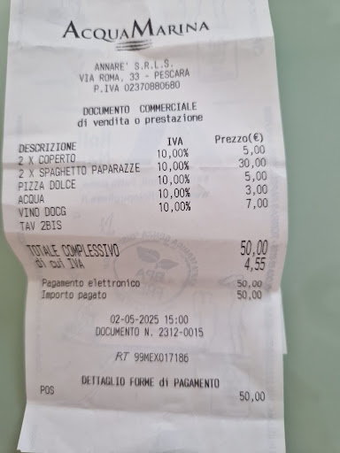 Read moreSiamo stati in questo locale attirati dall’insegna che indicava un pranzo completo di pesce a 14 euro. Purtroppo, l’esperienza non è stata all’altezza delle aspettative: ci siamo ritrovati a pagare 50 euro per due piatti di spaghetti alle vongole, che – oltre a essere scotti – contenevano vongole con sabbia (abbiamo mangiato lo stesso per fame, ma ciò non giustifica assolutamente una spesa del genere in un locale che si presenta esternamente come una gastronomia di pesce e non certo come un ristorante di lusso). Nel menù esposto all’esterno (allego in foto a questa recensione) il piatto di spaghetti alle vongole è indicato a 11€, mentre sullo scontrino ce lo hanno fatto pagare 15€ a porzione: una discrepanza davvero inaccettabile. Inoltre, ci è stato addebitato un extra di 5 euro per una “pizza dolce” che non abbiamo mai ordinato né ricevuto, a meno che il prezzo non si riferiva ad una minuscola sfogliatina con crema fatta con preparato industriale, il che è semplicemente insensato. Infine, un semplice calice di vino, servito mezzo vuoto, è stato fatto pagare la bellezza di 7€, e una bottiglietta d'acqua 3€ ... Non commento nemmeno... Un peccato davvero, perché la proposta sembrava interessante, ma la mancanza di chiarezza nei prezzi e la qualità del cibo di certo non all’altezza ci porteranno a...