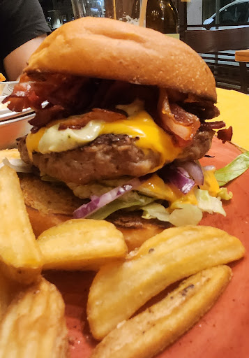 L'Esperienza Il Menu e la Qualità del Cibo: Ho ordinato un cheeseburger con carne di Rubia Gallega, una scelta un po' più costosa ma assolutamente ripagata. La carne era squisita, succosa e saporita, mentre il panino era ben assemblato e di ottima qualità. Le patatine fritte di contorno erano buone e accompagnate da una salsa chimicurry in omaggio.