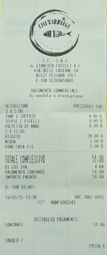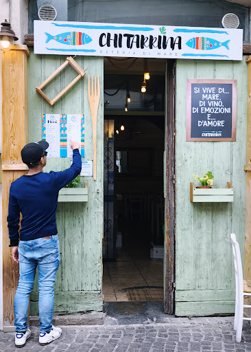 Read moreIn visita a Pescara vecchia ad agosto ci siamo fermati per pranzo alla Chitartina osteria di mare, a pochi passi dalla casa natale di D'annunzio. E' stata una bella sorpresa. Locale non grande, semplice ma accogliente e arredato con gusto, realizzato in una parte di quelle che erano le carceri borboniche della citta', risparmiate dai devastanti bombardamenti alleati dell' agosto-settembre 1943 che hanno raso al suolo buona parte della citta'. Se passate di la' fermatevi certamente, ma prenotate il vostro tavolo, il titolare, gentilissimo come le cameriere, ospita solo il numero di persone che sa di riuscire a servire bene e in tempi brevi. Tutto molto buono: polpo e patate, baccala alla diavola, sagne ceci e cozze, paccheri al sugo di scampi, il tutto accompagnato da un ottimo pecorino della casa (buono anche il rose'). Ottimo rapporto qualita' prezzo. Insomma siamo usciti contenti dell'esperienza, se torneremo a Pescara andremo di certo alla...