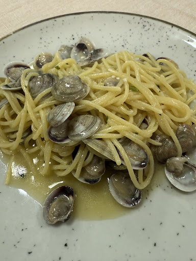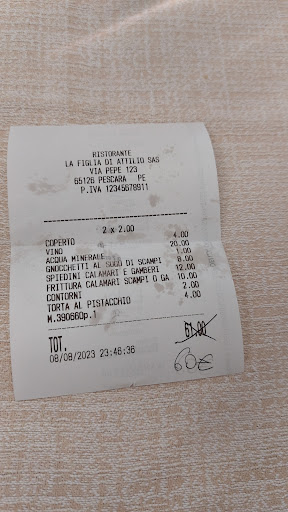 Read moreAbbiamo scelto questo ristorante contando di pranzare a base di pesce. Va bene il covid’ (niente menu’ su carta questione di igiene, ma la tecnologia aiuta!); va bene il fermo biologico (Adriatico! Ma esistono altri mari!) ma tolta la particolarità delle linguine verdi (spinaci) allo scoglio ( micro gamberi, 2 gamberetti, telline, 4 cozze e pezzettini di seppia rinsecchita) nulla di particolare. Anzi no! Chiediamo vino della casa...ma è finito, in alternativa ci propongono un Pasetti Pecorino del 2019, 350cc. x 7€ (una bottiglia da 750€ sul mercato si vende a €8,90). Risotto alla marinara, nulla di speciale (micro gamberetti, 2 gamberetti, pezzettini di seppia), una porzione di spiedini di pesce (gamberetti non gamberi e pezzettini di seppia) al sapore di carne, 1 fritto di paranza (i soliti gamberetti e i soliti pezzettini di seppia) fritti decentemente, 2 sorbetti a limone x €51! Saremo noi pugliesi un...