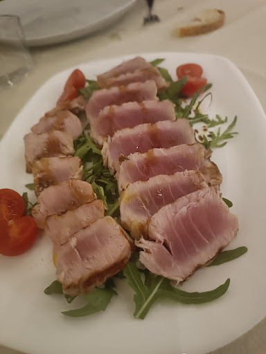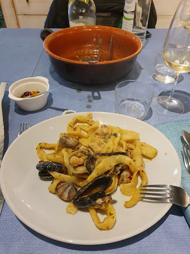 Incredible fresh fish brought in daily. Menu changes according to availability of the “fresh catch”. We had appetizers of pear shaped deep fried (no oil taste) Baccala coated with bread crumbs, coda di raspa salad, oysters, squid salad, salad with gamberetti, friselli with burrata and anchovies, then pasta with asparagus sauce, ravioli stuffed with cod in a tomato sauce, paccheri with baccala and sweet peppers, perfectly seared tuna, seafood fritto, lovely local wines (Pecorino and Chardonnay)grilled spiedini, and a special dessert with wild cherries, chantilli cream over slice of home...
