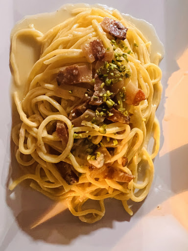 Sono andata in questo ristorante spinta dalle buone recensioni. Il posto è delizioso, il personale gentilissimo e professionale. Purtroppo però il cibo non è stato all’altezza delle nostre aspettative, considerando appunto le recensioni più che positive in merito. Abbiamo ordinato una parmigiana estiva che si è rivelata una caprese con melanzane grigliate. Buona come quella che potrei mangiare a casa, con la differenza che qui ci è costata 9€. Per primo ho presto chitarra all’uovo con Guanciale e pistacchi di bronte, ma anche in questo caso il piatto si è presentato con il condimento completamente slegato dalla pasta, per cui mangiandolo sentivo solo il sapore della pasta all’uovo e la sapidità, decisamente esagerata, che non credo fosse dovuta solo dal guanciale, probabilmente era scappato anche un po’ troppo sale nel condimento o nell’acqua della pasta. Inoltre a mio avviso il guanciale era tagliato troppo grande per quel tipo di pasta, per cui si faceva fatica ad arrotolare la chitarrina riuscendo a raccogliere nello stesso boccone anche il guanciale. Mio marito ha preso una tartare invece. La qualità della carne era ottima, peccato che è stata servita con sopra una salsina fruttata, a lui è sembrato mango, ma non ne sono sicura in quanto non l’ho assaggiata, che a lui non è piaciuta, non amando questo tipo di accostamenti. In questo caso è una questione di gusti personali, però credo che vada detto al momento dell’ordine (cosa che non ci è stata invece specificata) in modo che il cliente possa decidere meglio cosa ordinare. Infine delusione anche per il dessert, presentato dal cameriere come una sbrisolona con crema chantilly e invece mi sono ritrovata con un piatto di crema chantilly in cui erano state inserite delle cialdone di sfoglia, credo quasi sicuramente commerciali e non di produzione propria, ma non ne ho la certezza. Siamo andati via con l’amaro in bocca e 60€ in meno, che avrei reputato un prezzo giustissimo se avessi mangiato bene, ma in questo caso lo reputo decisamente caro per la qualità della cucina. Faccio un ultimo appunto in merito ai secondi, in quanto in menù non sono presenti secondi che prevedano di essere serviti completamente cotti, ma al sangue o comunque cotture medie (come filetto e tagliata) e trovo questo un grosso limite per chi non ama o non può mangiare questo tipo di cotture...