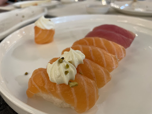 Read moreCon i colleghi a pranzo abbiamo provato la formula all you can eat... molto interessante di questo recente e bel locale... dove tutto il personale è gentile e in norma alle regole Covid - 19, all'entrata ti chiedono il numero del cellulare controllano la febbre e ti accompagnano al tavolo distanziato dove puoi togliere la mascherina 😷 e a fine pranzo puliscono il tavolo e le sedie... forse l'unica cosa che purtroppo modificherei è il bellissimo menù che per questo strano periodo non è di facile sanificazione... Per il resto il servizio è stato veloce e x ogni piatto ti ricordano cosa ti stanno portando e per quante persone... molti sono anche scenici...oltre che quasi tutti buoni... a nostro gusto le uniche portate un po' sotto le aspettative erano le fritture e alcuni involtini... forse un po'troppo alta la pastella... e non molto saporiti... Per il resto il salmone I gamberi e il pesce in generale crudo o cotto... il riso intorno... o le paste erano quasi perfette.... Il locale è molto bello luminoso con grandi vetrate...frequentato... e con buon...