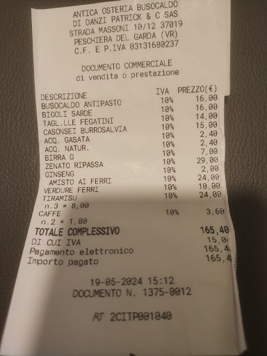 Read moreDi ritorno verso casa con un'altra coppia di amici, abbiamo per caso notato la segnaletica che portava al ristorante che poco dopo abbiamo contattato prenotando un tavolo esterno in quanto fumatori. Giunti in loco una gentile cameriera ci ha fatto accomodare al tavolo.Appena seduti,ad un cameriere giovane e poco pratico, (come la maggior parte del personale) abbiamo ordinato un litro di vino locale (€.26.00) che ha portato in 2 caraffe da mezzo litro non specificando che il prodotto viene venduto a bottiglia spiegateomi poi dal proprietario al quale ho chiesto anche un posacenere visto che non vi erano cartelli con divieto di fumo ,ci ha detto che per fumare bisognava andare all'esterno della tettoia (ho visto un'altro cliente fumare in strada).Ho ordinato 1 antipasto freddo della casa,un primo piatto di tagliatelle 3 sughi che mi sono arrivati tutti e due insieme dovendo consumare le tagliatelle per prime per evitare che si raffreddassero ,la mia compagna e la coppia di amici grigliata mista con peperonata e verdure grigliate che hanno atteso mentre ero già servito. Al tavolo vicino ,famiglia di turisti con 2 bimbi in tenera età,uno dei camerieri ha stappato una bottiglia di bollicine che avevano ordinato rischiando di colpire qualcuno facendo fuoriuscire 1/3 del vino. Il proprietario in maniera sgarbata si e permesso di ammonire la mia compagna durante una breve video chiamata con la nipotina dicendo che era regola del locale per la tranquillità dei clienti.(zanzare e mosche comprese??).Delle 3 grigliate ordinate arriva il cameriere con 2 vassoi per 3 persone e dopo esserci lamentati,le riporta in cucina ritornando con 3 vassoi.Non abbiamo ordinato né dolce né caffè, abbiamo chiesto il conto e siamo andati via. Cibo mediocre ,personane e servizio pessimo a livelli di un classico ristorante "trappola per turisti "in...