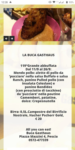 Read moreUno dei miei posti preferiti, ci ero stato circa un anno e mezzo fa e non vedevo l'ora di tornarci di nuovo. Purtroppo provenendo da Padova non è così facile la cosa. La Buca è un posto così semplice ma allo stesso tempo difficile da descrivere, bisogna provarlo, con la consapevolezza che magari non può piacere a tutti. Il cibo è ottimo, il servizio veloce e sia Hermann che la cameriera (non so il tuo nome, scusa!) sono simpatici e si fermano volentieri per due chiacchiere, se possono. Il locale fa delle Abbuffate periodiche, che non sono ancora riuscito a provare, le volte che sono stato qua non c'era nessuna Abbuffata in corso, purtroppo. Il Big Buca, un panino impegnativo ma molto buono, è stato un'ottima alternativa comunque. Insomma, spero di tornare presto!