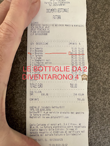 IN PIÙ mi sono accorto esaminando la fattura che addirittura mi hanno addebitato 4 bottiglie invece di 2 ed ecco chiarito come hanno fatto a far lievitare il conto furbamente . SOLO Dopo AVER LETTO la mia recensione hanno cercato di correre ai ripari telefonandomi dicendomi che si erano sbagliati MA RIPETO SOLO DOPO aver letto la RECENSIONE. ( una...