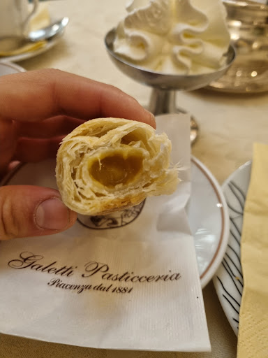 Sono venuta in questa pasticceria ispirata da come altre persone parlavano della cioccolata calda e del cannoncino allo zabaione, e che dire: questa è proprio una delle volte in cui ho fatto bene a fidarmi di altre recensioni. La cioccolata calda mi porta indietro a quella fatta in casa quando ero bambina, col giusto mix di cacao e cioccolato. L'aggiunta della panna montata fresca non fa altro che migliorarne il gusto. Il cannoncino, però, rimane il top di gamma dell'esperienza. La sfoglia mi ricorda la tecnica con cui sono prodotti i cornetti cosentini, bella croccante; mentre lo zabaione è semplicemente stellare. Poche volte a Piacenza ho potuto deliziare le papille gustative con una zabaione che sapesse effettivamente di zabaione e questo ne è un esempio lampante. Voglio proprio tornare per provare altro dal menù. L'ambiente interno ti trasporta in un'altra epoca e ti accoglie con la sua ricchezza di particolari. L'unico consiglio che mi sento di dare è di pulire con più costanza le lampade, perché era visibile qualche ragnatela. Per un locale così chic, non è una bella presentazione. Rimane comunque un particolare da poco, se messo a confronto con la...