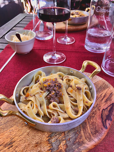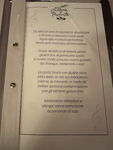 I ate here two times with family. First of all we got helped amazingly by the staff. They are the nicest people. Even though the restaurant was very busy they took the time to talk with us and explain everything about our wine and food. They can speak English very well. All the food is made by the owner herself, so it is very personal. The food is absolutely amazing and freshly made with local product. They use seasonal ingredients to make the food even more fresh, so the menu changes sometimes. The location is beautifully located in the center of Pianezza. The interior is beautiful and matches with the name of the Osteria. There are music instruments on the walls and it is decorated in old rustic Italian style. They also have a little paradise between the greenery outside. I absolutely recommend this...