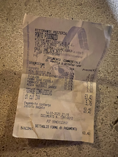Read morePranzato in 2 con menù del giorno che comprendeva un primo (linguine alle vongole ) e un secondo ( baccalà al forno con patate) con un costo di 20€ a testa ....tutto sommato non male ma sicuramente non fatte al momento in quanto dall' ordinazione le linguine sono arrivate al tavolo nel giro di 4 minuti , e anche per il baccalà , credo fortemente che siano stati piatti riscaldati per quanto riguarda appunto il menù del giorno , tutt' altro se avessimo ordinato alla carta , vedendo comunque altri tavoli che ordinavano alla carta e i piatti ci mettevano anche 10/15 minuti ad uscire e posso capirlo perché è riportato anche sul menù che i tempi di attesa potrebbero prolungarsi in quanto preparate tutto al momento...bhe....diciamo che lo fate solo con piatti alla carta e non con i menù del giorno ma pazienza.Chiudendo il discorso cibo apro velocemente il discorso bevande....abbiamo optato per un rosé da 29€ a bottiglia pensando di bere un vino già importante ma purtroppo ci siamo sbagliati ,nulla di che ,un vino comunissimo che probabilmente si potrebbe trovare anche nei supermercati con un costo di 4/6€ e non lo dico per fare il fenomeno ma lo dico perché nel nostro piccolo di vini diciamo che ce ne intendiamo un po' (ma questo è irrisorio) , ma almeno c'è una cosa che mi ha fatto davvero sorridere ...Ordiniamo il vino ,1 minuto dopo la cameriera ci appoggia i calici sul tavolo ,subito dopo arriva il vino che viene stappato davanti a noi come giusto che sia e magicamente il vino viene versato inizialmente come assaggio nel bicchiere per l acqua e successivamente viene versato in entrambi i bicchieri per l acqua come inizio pasto che prontamente ho provveduto immediatamente a versare nei calici ,ma può succedere ,peccato che 2 tavoli affianco al nostro non è successo ,bhe c'è anche da dire che i 2 signori hanno ordinato alla carta . Totale pranzo 74€ in 2 , non mi lamento più di tanto del prezzo perché diciamo che c'è anche la vista mare ,ma per quanto mi riguarda per un pranzo così non spenderei più di 50€ ...Peccato,ma non...