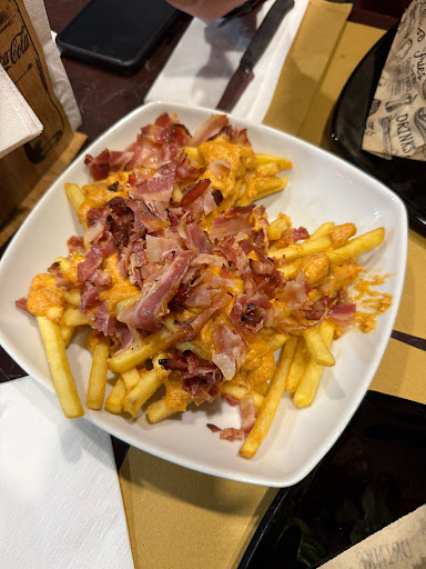 Read moreLocale in stile pub, accogliente grazie alle abbondanti rifiniture in legno. Abbiamo preso in due delle patatine con cheddar e bacon da condividere (in foto), buonissime. Poi abbiamo preso due hamburger, un classico e un hot, non ho la foto perché dopo averli assaggiati non abbiamo resistito e c'è li siamo trangugiati.. erano davvero spettacolari, grandi, saporiti, molto soddisfacenti, davvero fantastici! Il servizio è stato cordiale e rapido, siamo andati un sabato sera di settembre quindi neanche da dire che non c'era nessuno. Chi si lamenta del servizio deve aver preso una serata sbagliata o particolarmente affollata. Consiglio vivamente di andare e mangiare gli hamburger...