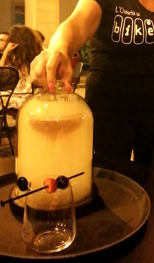 Oltre l arte della miscelazione la Marina aggiunge una abilità nel gestie il fumo che rimane felicemente intrappolato dentro il liquido rilasciandosi ogni tanto con una bolla da sotto il ghiaccio che sprigiona odori meravigliosi. Annusare , vedere e assaporare , cos'altro chiedere ? Questo 'intruglio' è nato li per li, voglio inensamente pensare disegnato su di me. Ecco la differenza tra il Professionista e il Maestro, il Maestro sa inventare cose nuove mai pensate prima partendo solo da un idea e sa renderti unico anche se solo per il tempo di un bicchiere. Questo è bere e quando si beve col gusto si beve solo responsabilmente. Per dirla alla scozzese : che Dio ti mantenga in piedi...