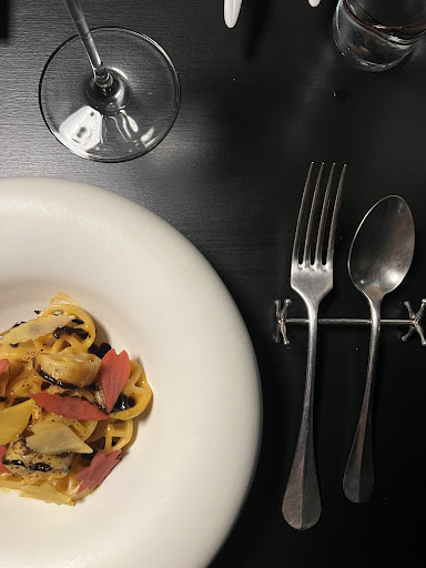 Read moreIl locale è sorprendente perché, all'interno di un contesto antico e tradizionale, convivono armoniosamente scelte di design innovative e contemporanee. Le foglie in lamiera traforata appese alla volta in mattoni all'esterno e il maniglione della porta di ingresso sono un primo assaggio di quello che si troverà all'interno. Il locale e suddiviso in più ambienti sapientemente schermati, in modo da garantire una certa privacy ma permettere al tempo stesso il dialogo tra le diverse zone, comprese la cucina e la cantina dei vini. È molto coraggiosa la scelta del nero, che "cola come pece" sulle murature in laterizio, e l'uso del metallo color antracite dei componenti d'arredo e dei setti che separano gli ambienti. Questi scelte materiche e cromatiche, supportate da uno studio attentissimo delle soluzioni illuminotecniche, creano un'atmosfera intima. Consiglierei a tal proposito questa location per momenti speciali da vivere in coppia ma anche per pranzi/cene in gruppo. Da architetto non posso che fare i complimenti all'interior designer che ha progettato gli spazi e allo Chef che ha osato sviluppare un concept di grande carattere che, proprio perché non banale, potrebbe non incontrare il favore di tutti. Già solo per questo motivo varrebbe la pena visitare gli spazi per una colazione di lavoro. Dal mio punto di vista il locale, con la sua identità decisa e contrastante, è specchio della cucina. Dal punto di vista delle proposte enogastronomiche posso solo dire che si è trattatato di un'esperienza sensoriale, fatta di contrasti, di sapori che si inseguono e si intrecciano tra loro, di consistenze, colori e aromi sapientemente miscelati. Potrei descrivere i vari piatti, raccontare come un ingrediente, apparentemente banale come una patata, possa al contrario sorprendere o quante sfumature di dolce si possano ottenere con una carota, ma la verità e che questo tipo di cucina non va descritto ma provato. Ho apprezzato molto anche la "narrazione" della responsabile di sala che ha saputo valorizzare ogni singola portata. Altrettanto posso dire della sommelier che ha descritto i vini degustati con grande competenza, ma anche con una certa e apprezzata informalità. Ottimi gli abbinamenti vino/portata. Consiglio fortemente questo ristorante e conto di ritornare, verosimilmente in altre stagioni, per provare le rivisitazioni della cucina tradizionale in chiave innovativa e creativa, con l'uso dei prodotti...