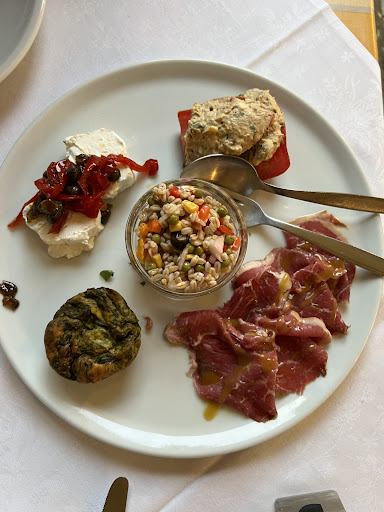 Appena accomodati si viene serviti da un ragazzo estremamente gentile che porta acqua e vino, poco piu tardi arriva a leggere il menù una signora molto carina e disponibile, elenca un'infinità di piatti che cambiano ogni volta che andiamo. Noi prendiamo sempre il mix di antipasti da condividere perché sono veramente tutti troppo buoni. (Consiglio di condividerli perché sono abbondanti); i primi sono ben cucinati e spesso ci sono paste ripiene; i secondi sono studiati e pensati da uno chef appassionato e cortese. Una sera abbiamo mangiato delle costine di maiale marinate nelle spezie e paprika, cotte a bassa temperatura e passate sulla griglia per la maiardizzazione finale, uno spettacolo! Davvero davvero buonissime!!! Il posto è incastonato nelle colline che affacciano sul Pinese e il Chierese, ha un grande parcheggio e dispone di un bel dehors. Sui dolci non so argomentare perché non li ho mai presi. Ho solo assaggiato una volta il loro zabaione e anche quello era strepitoso. Locale...