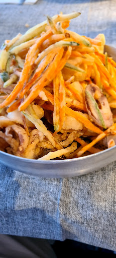 Di secondo abbiamo preso il fritto. E qui sono sicuro: il miglior fritto mai mangiato. Asciuttissimo e croccante. Gamberi, calamari e totani con carotine, zucchine e cipolla pastellati. Una meraviglia per il palato.